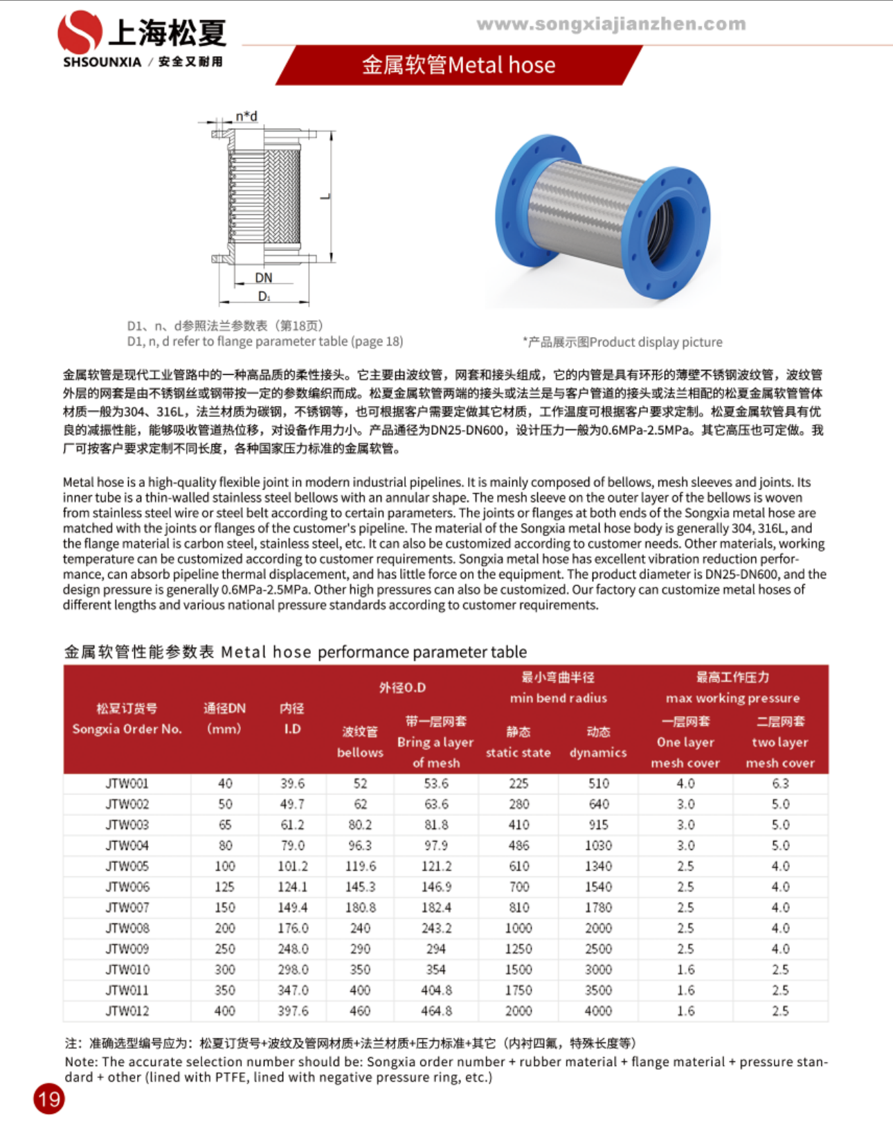金属软管是现代工业管路中的一种高品质的柔性接头。它主要由波纹管,网套和接头组成,它的内管是具有环形的薄壁不锈钢波纹管,波纹管外层的网套是由不锈钢丝或钢带按一定的参数编织而成。松夏金属软管两端的接头或法兰是与客户管道的接头或法兰相配的松夏金属软管管体材质一般为304、316L,法兰材质为碳钢,不锈钢等,也可根据客户需要定做其它材质,工作温度可根据客户要求定制。松夏金属软管具有优良的减振性能,能够吸收管道热位移,对设备作用力小。产品通径为DN25-DN600,设计压力一般为0.6MPa-2.5MPa。其它高压也可定做。我可按客户要求定制不同长度,各种国家压力标准的金属软管。